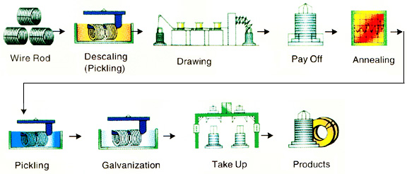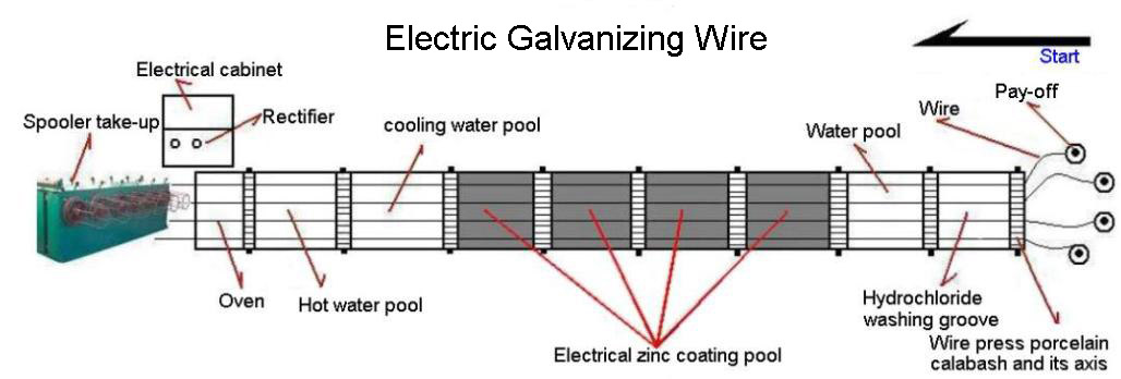 Structure of the production line: Pay-off, rectifier, packing frame, oven, electrical cabinet, zinc coating groove, hot and cold water groove, hydrochloric acid pickling groove, wire unloading machine, etc.